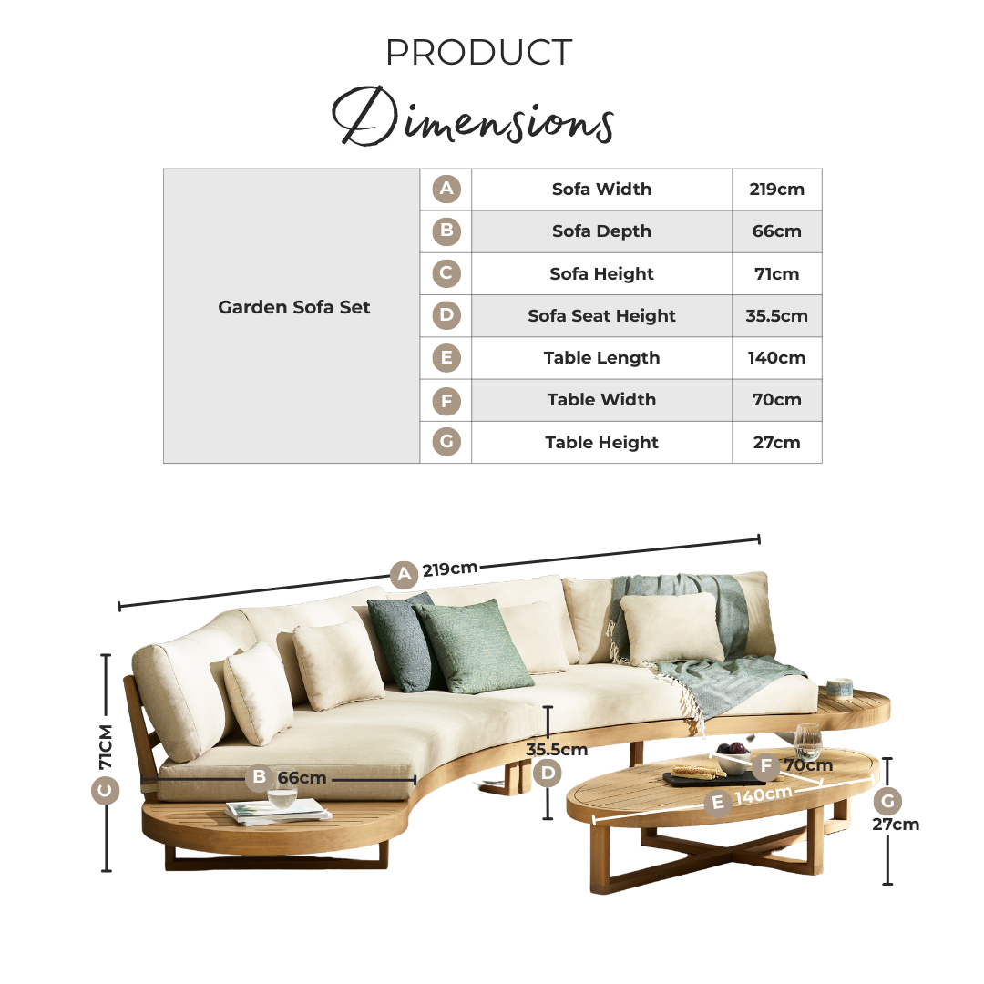 Width (cm) 380 Height (cm) 72 Depth (cm) 181 Display Variant Yes Colour Natural Material Wood Finish Natural Feature 1 6 seat wooden curved outdoor garden sofa Feature 2 Statement rounded design blends form and function Feature 3 Comes with matching oval wooden coffee table Feature 4 Plump cream fabric cushions Feature 5 1 year warranty delivery_time !Please Note! - Free delivery with earliest delivery in 2 working days* delivery_pick_a_day Pick a delivery day to suit you delivery_door_to_door Delivered to the room of your choice, up to two flights of stairs Chair Finish Natural Chair Frame Material Wood Chair Upholstery Material Fabric Water Resistant Cushion Yes Chair Cushion Colour Cream UV Resistant Yes Chair Frame Colour Natural Chair Height (cm) 71 Seating Depth (cm) 66 Seat Height (cm) 35.5 Seat Padding Thickness (cm) 16 Back Padding Thickness (cm) 22 Table Shape Oval Table Colour Natural Table Material Wood Table Finish Natural Table Surface Thickness (cm) 1 Table Type Coffee table Number Of Seats 6 Table Height (cm) 27 Table Width (cm) 70 Table Length (cm) 140 Seat Weight Capacity PP (kg) 110 Table Weight Capacity (kg) 50 Product Weight (kg) 86.5 Assembly Details Assembly Required Intro Offer? No Date Listed 2025-10-01T00:00:00.000Z Swatch Colour Wood merch_category Garden Sofa Sets Feet Material Plastic Chair Back Height (cm) 37 Table Base Width (cm) 70 Additional Lead Time 30 merch_rank 5 USP Feature 1 Solid Wood USP Feature 1 Description Crafted from solid wood for natural strength and stability. USP Feature 2 Splash-Proof Cushions USP Feature 2 Description Cushion covers help repel moisture and are quick drying after light rain. USP Feature 3 UV-Resistant Materials USP Feature 3 Description Designed to help prevent fading and sun damage, maintaining colour and appearance over time. USP Feature 4 Exceptionally Durable & Long-Lasting USP Feature 4 Description Acacia is a dense hardwood that resists scratches, dents, and everyday wear- ideal for dining and living furniture that sees regular use. USP Feature 5 Flexible Modular Configuration USP Feature 5 Description Adaptable layout allows you to arrange seating to suit your space. USP Feature 6 Easy Assembly USP Feature 6 Description Designed for simple assembly with clear instructions included. Collection Wisley _promo_message Garden Sale Now On | Free and Fast Delivery USP Feature 1 Image https://s3-eu-west-1.amazonaws.com/cdn.production.aws.eu-w1.pimberly.com/public/asset/raw/5fbbce1a2fd14f001bd75232/b1a3f042/69c27f2d04511b6cbb000021/WISL-OUT-CUR-SOF-SET-NAT-CRM-6_USP1.jpg USP Feature 2 Image https://s3-eu-west-1.amazonaws.com/cdn.production.aws.eu-w1.pimberly.com/public/asset/raw/5fbbce1a2fd14f001bd75232/b1a3f042/69c27f2d04511b6cbb000022/WISL-OUT-CUR-SOF-SET-NAT-CRM-6_USP2.jpg USP Feature 4 Image https://s3-eu-west-1.amazonaws.com/cdn.production.aws.eu-w1.pimberly.com/public/asset/raw/5fbbce1a2fd14f001bd75232/b1a3f042/69c27f2d04511b6cbb000024/WISL-OUT-CUR-SOF-SET-NAT-CRM-6_USP4.jpg USP Feature 3 Image https://s3-eu-west-1.amazonaws.com/cdn.production.aws.eu-w1.pimberly.com/public/asset/raw/5fbbce1a2fd14f001bd75232/b1a3f042/69c27f2d04511b6cbb000023/WISL-OUT-CUR-SOF-SET-NAT-CRM-6_USP3.png USP Feature 5 Image https://s3-eu-west-1.amazonaws.com/cdn.production.aws.eu-w1.pimberly.com/public/asset/raw/5fbbce1a2fd14f001bd75232/b1a3f042/69c27f2d04511b6cbb000025/WISL-OUT-CUR-SOF-SET-NAT-CRM-6_USP5.png USP Feature 6 Image https://s3-eu-west-1.amazonaws.com/cdn.production.aws.eu-w1.pimberly.com/public/asset/raw/5fbbce1a2fd14f001bd75232/b1a3f042/69c27f2d04511b6cbb000026/WISL-OUT-CUR-SOF-SET-NAT-CRM-6_USP6.png promo_bullet IMPORTANT: This is a pre-order item. Delivery available in 4-5 weeks. -