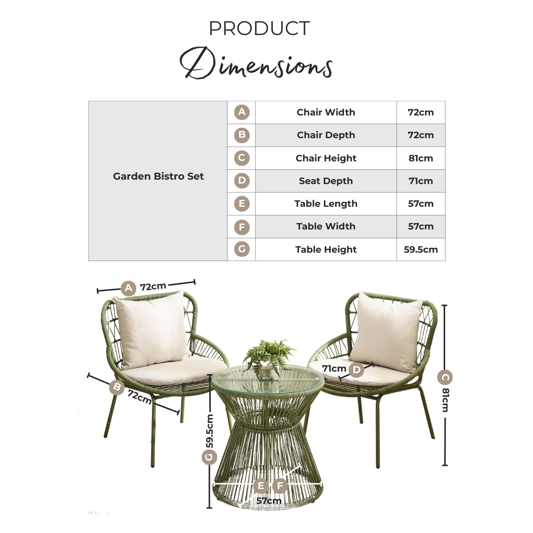 Width (cm) 72 Height (cm) 81 Depth (cm) 72 Display Variant Yes Colour Green Material Rattan Finish Rattan Feature 1 Stylish compact garden table and 2 chairs bistro set Feature 2 Stunning green metal and green rattan with woven details Feature 3 Clear glass table top on matching outdoor side table Feature 4 Plump cream cushions to contrast with the green Feature 5 2 year warranty delivery_time Free next working day delivery available on orders before 8pm* delivery_pick_a_day Pick a delivery day to suit you delivery_door_to_door Door to door delivery. Delivery to flats cannot be taken up stairs or in lifts Chair Finish Powder Coated Chair Frame Material Metal Feet Material Plastic Chair Upholstery Material Fabric Rattan Type Poly Rattan Water Resistant Cushion Yes Chair Cushion Colour Cream UV Resistant Yes Chair Frame Colour Green Chair Depth (cm) 72 Chair Width (cm) 72 Chair Height (cm) 81 Chair Back Height (cm) 39 Seating Depth (cm) 71 Chair Weight (kg) 5.2 Seat Height (cm) 42 Arm Height (cm) 59 Seat Padding Thickness (cm) 5 Back Padding Thickness (cm) 18 Table Shape Round Table Colour Green Table Material Rattan Table Finish Rattan Table Base Width (cm) 57 Table Surface Thickness (cm) 0.5 Table Type Side Table Number Of Seats 2 Table Height (cm) 59.5 Table Width (cm) 57 Table Length (cm) 57 Seat Weight Capacity PP (kg) 120 Table Weight Capacity (kg) 30 Product Weight (kg) 20 Assembly Details Assembly Required Intro Offer? No Date Listed 2026-02-10T00:00:00.000Z Swatch Colour Green merch_category Garden Bistro Sets _promo_message Save 20% on Garden Furniture With Code: EARLY20 custom_badge #914e3b|#ffffff|20% off with code Additional Lead Time 0 merch_rank 575 -